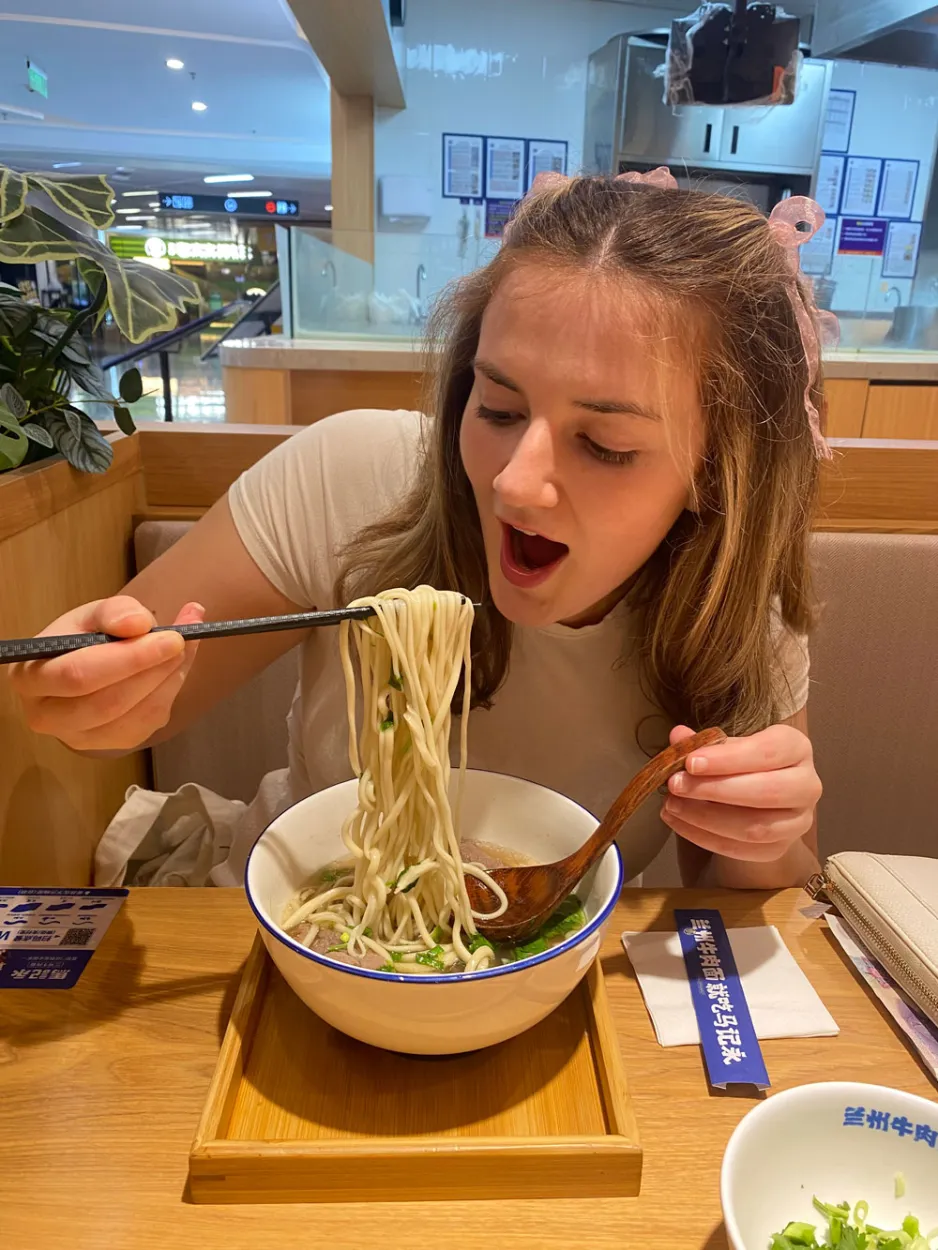 After settling into our hotel, we went to a nearby mall to get some food. I was pleasantly surprised to find a variety of small, intimate restaurants with fresh produce on display, ready to be cooked to order, instead of the fast food I was expecting. I enjoyed my first meal at a ramen restaurant, where the noodles were made from scratch and hand-pulled right in front of us. The entire meal cost only $4 CAD, providing a delicious yet affordable culinary experience.