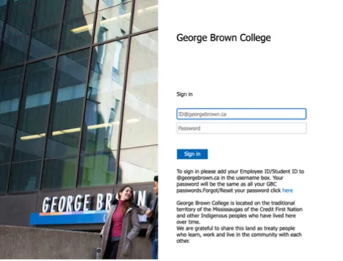 - If you are not already signed in, select your account and log in as usual using your regular, numbered GBPID@georgebrown.ca and password.