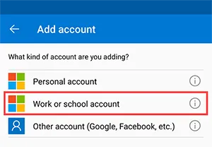 Within the app, choose + Add account and then choose 'Work or school account'.